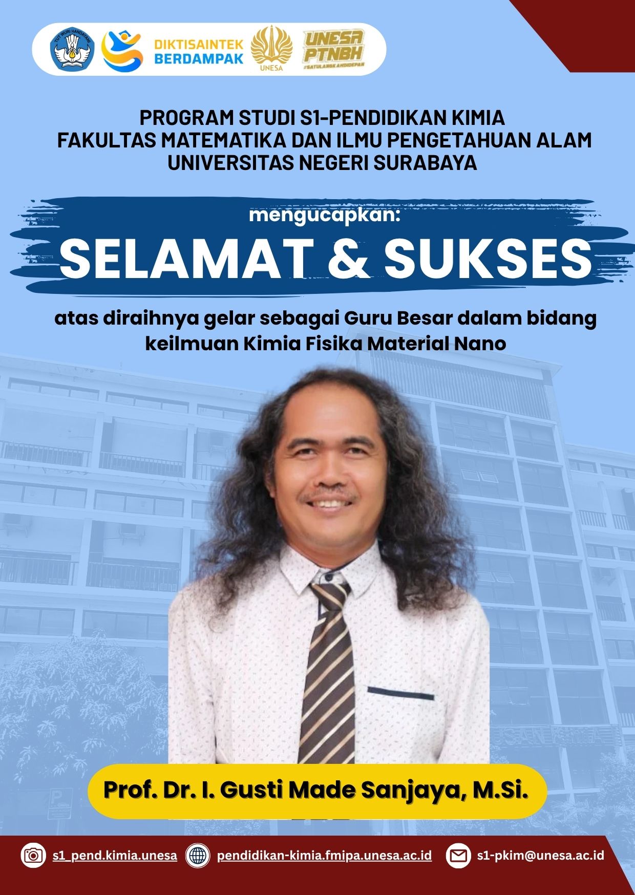 Prof. Dr. I Gusti Made Sanjaya, M.Si. atas diraihnya gelar sebagai Guru Besar di bidang Kimia Fisika