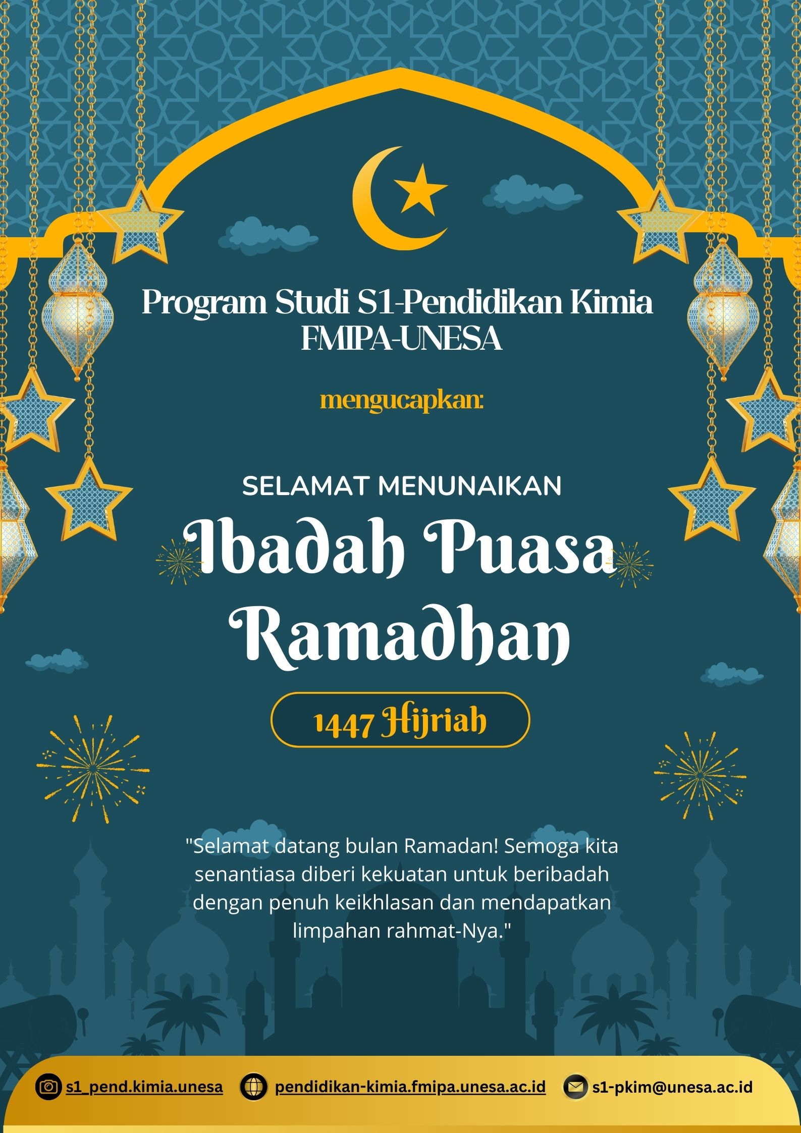 Keluarga besar Prodi S1 Pendidikan Kimia Universitas Negeri Surabaya (UNESA) mengucapkan Selamat Menunaikan Ibadah Puasa Ramadhan 1447 H kepada seluruh mahasiswa, dosen, tenaga kependidikan, alumni, dan masyarakat luas yang menjalankan.